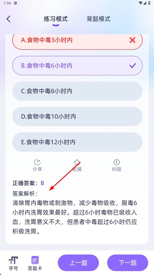 提交答案后,您不仅能查看正确答案与对应的解析,还可以进行分享、收藏、纠错等相关操作。