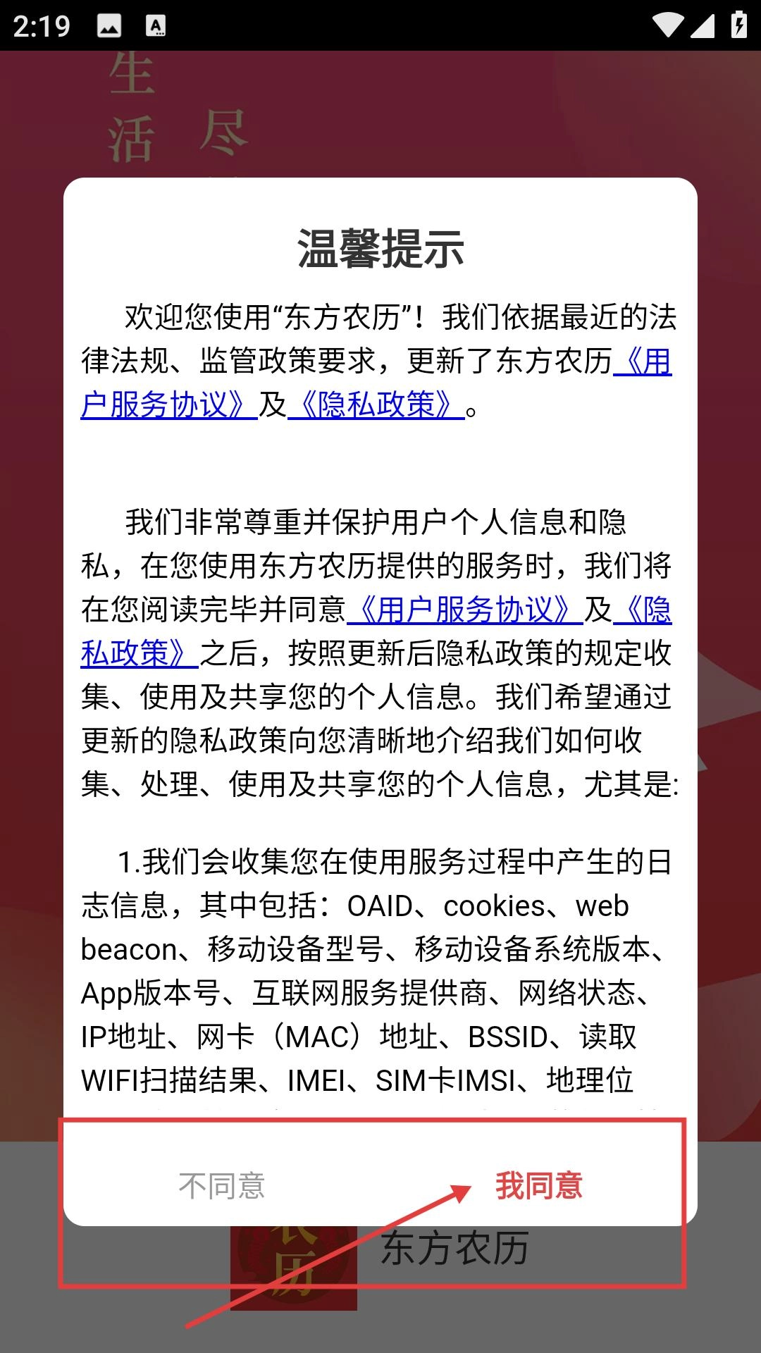 打开东方农历应用时,会弹出包含用户服务协议与隐私政策的温馨提示页面,点击【我同意】按钮后,即可进入主界面开启功能使用。