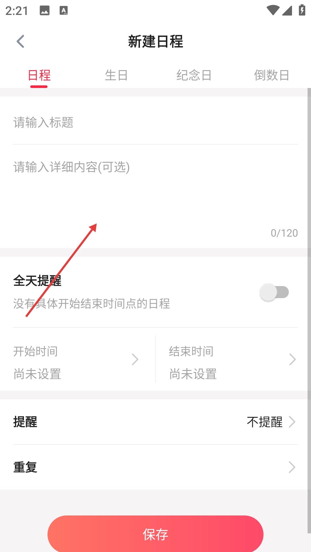 在新建日程的界面里,能够输入日程的标题以及详细内容,还可以设置全天提醒、开始时间、结束时间、提醒方式和重复周期等选项。