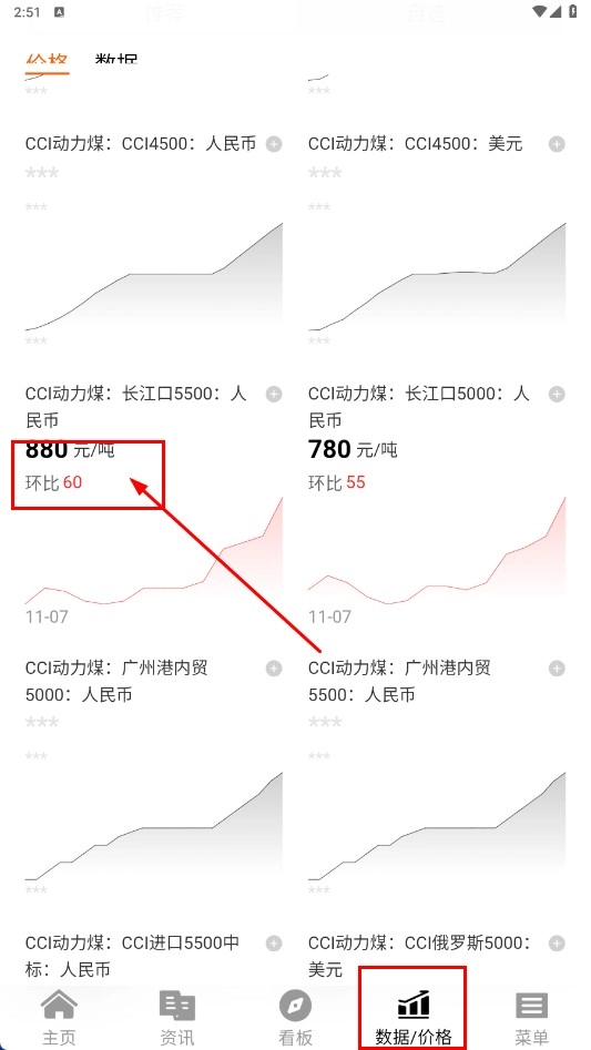 点击【数据/价格】板块,可查看【CCI】分类下【动力煤】长江口5500的价格为880元/吨,同时能看到其环比数值为60。