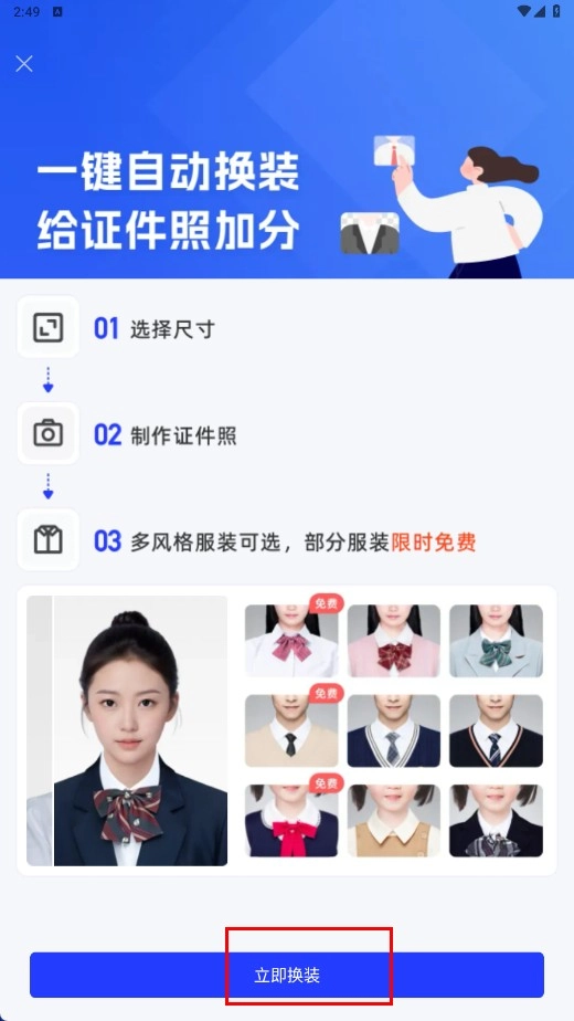 在换装页面,点击【立即换装】功能按钮,即可进入尺寸选择环节。