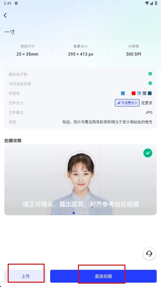 进入尺寸详情页面后,您可以选择【上传】已有的照片,或者通过【直接拍摄】获取新照片,以此来制作证件照。