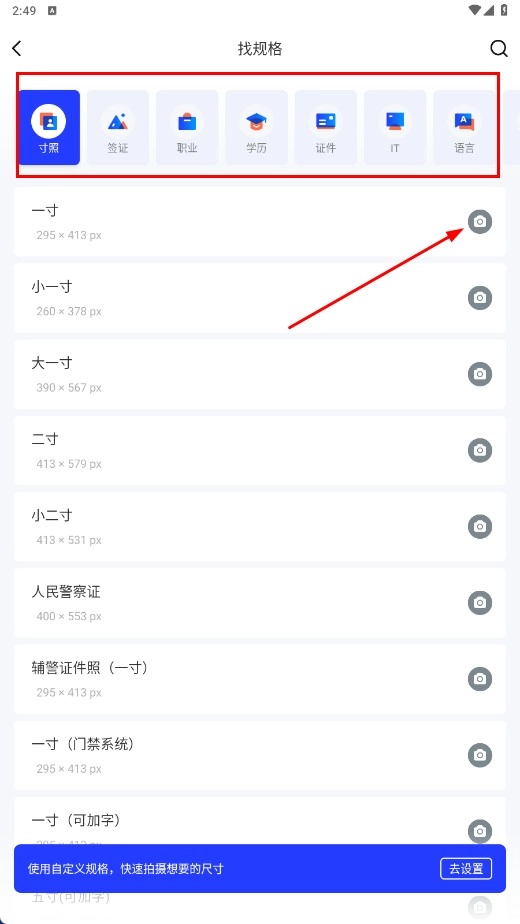 在查找规格页面时,先挑选证件照的尺寸类别(像寸照、签证照这类),接着选定具体的尺寸规格(例如一寸)。