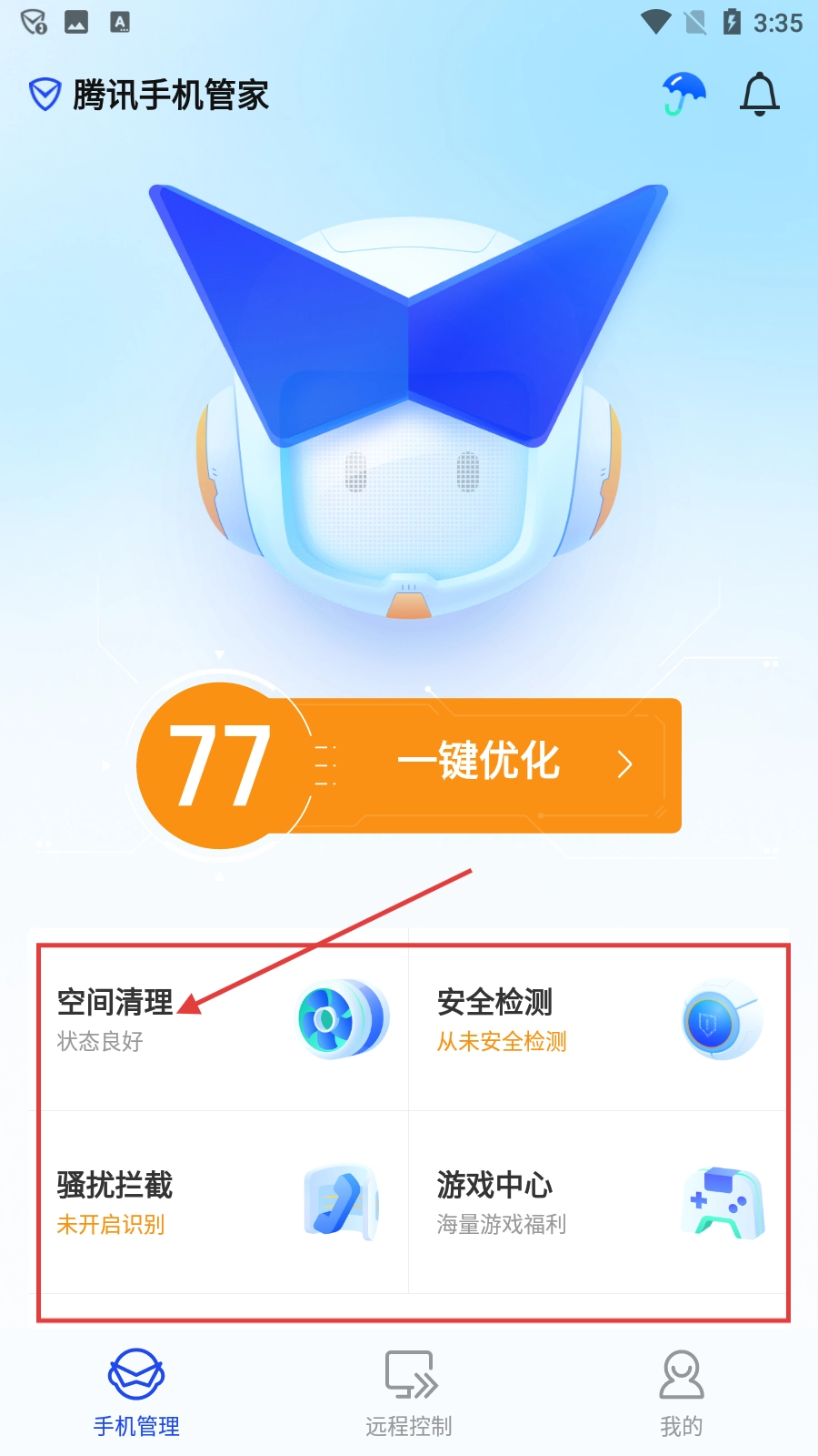 打开【腾讯手机管家】应用,进入手机管理界面后,找到并点击【空间清理】这一选项。