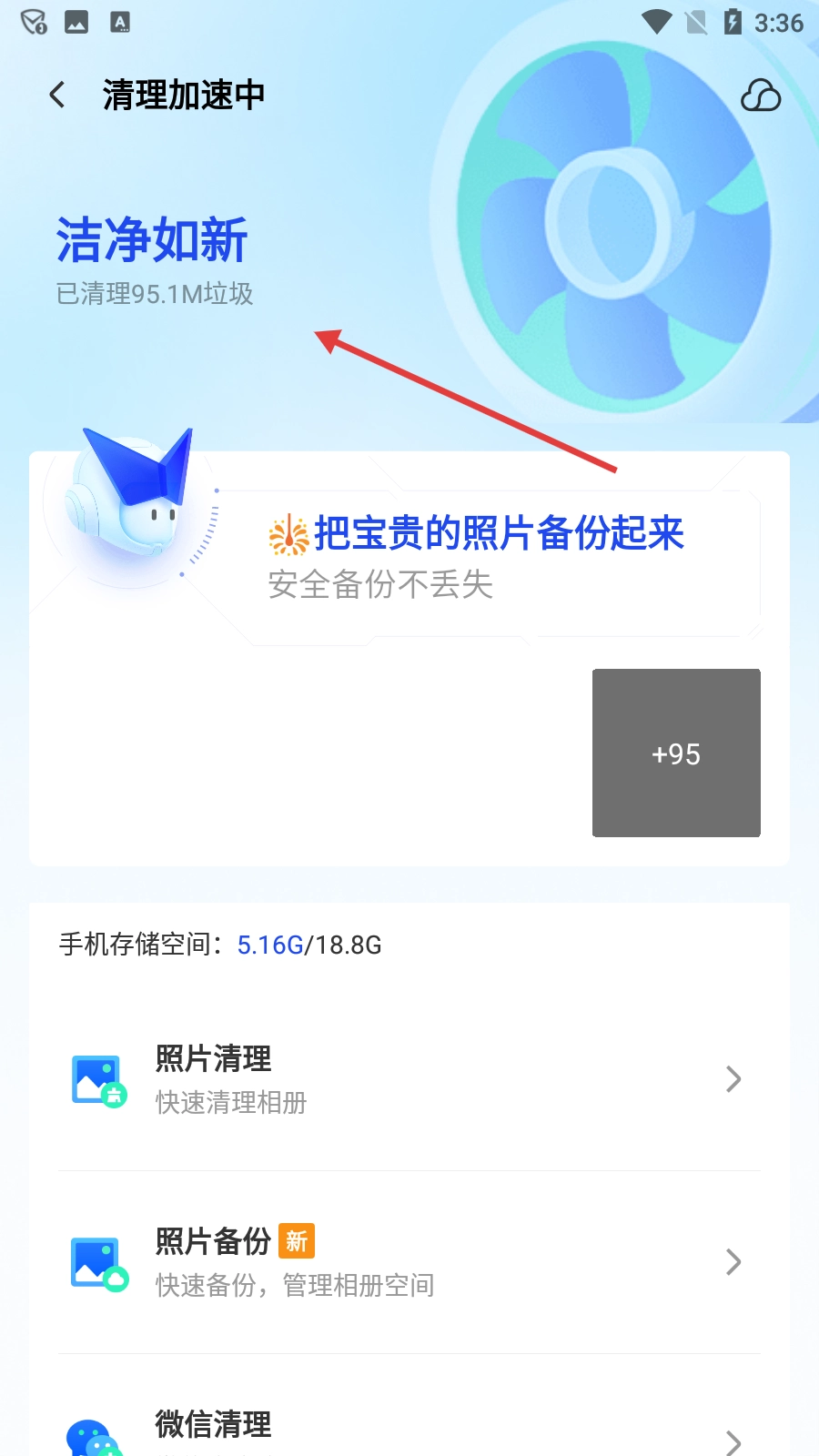清理结束后,页面会呈现“洁净如新”的提示,同时还会显示已清理垃圾的大小。