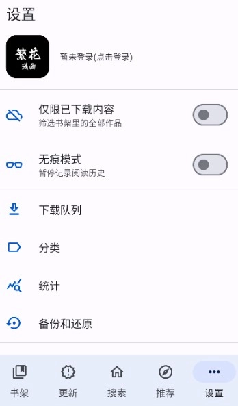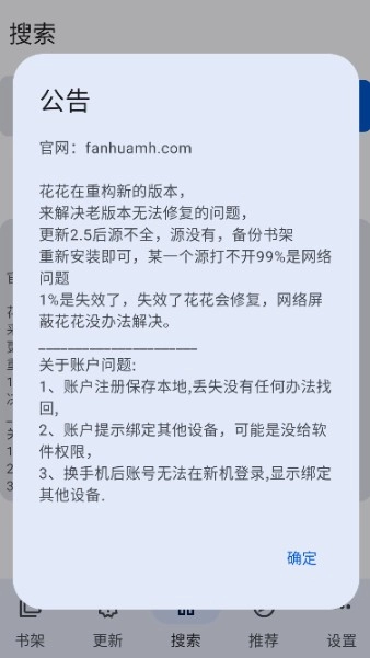 正版界面设有书架、更新、搜索、推荐、设置这五个栏目,请大家注意认准。