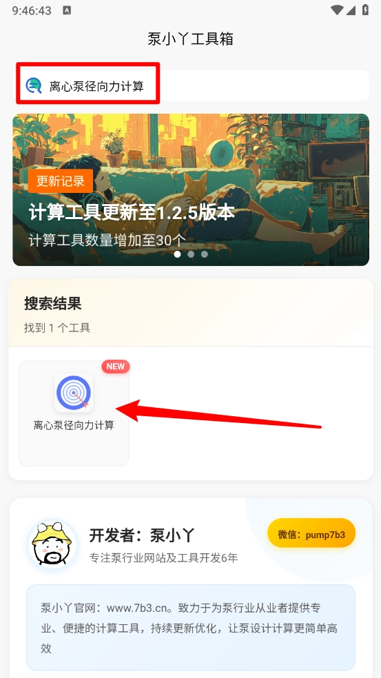 进入计算页面后,选择“泵型”选项,输入相关参数,再点击“开始计算”按钮。