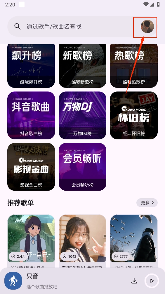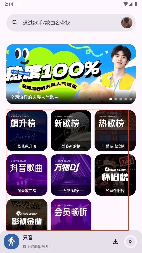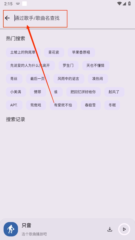 也可以点击主页顶部的搜索框,通过歌手姓名或歌曲名称进行查找。