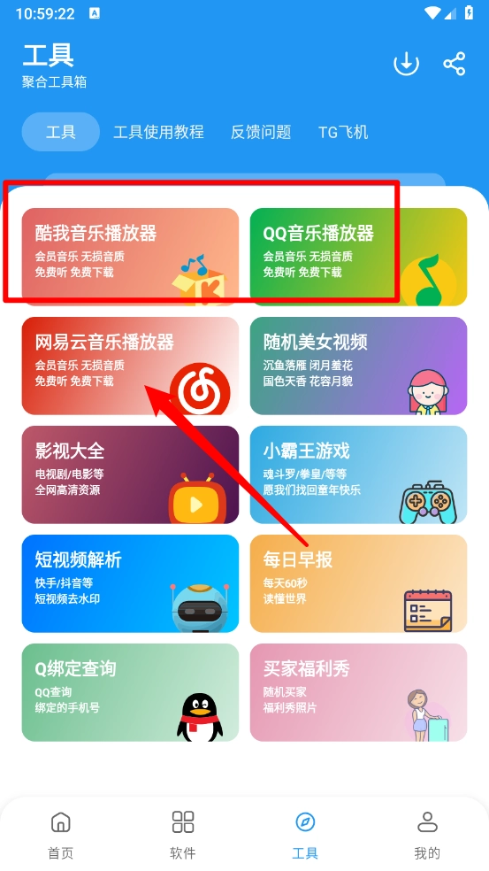 如图,在工具页面涵盖三大音乐播放器。