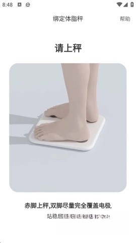 赤脚踩在秤上,双脚贴住电极,保持稳定约20秒,等待设备连接完成。