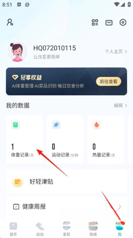首先打开好轻,点击我的数据,然后进入体重记录;