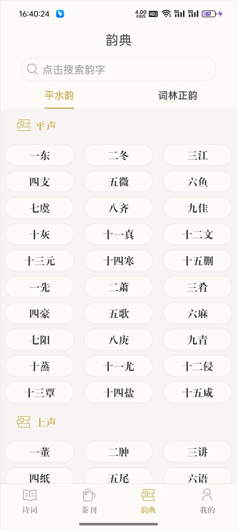 韵典模块以古汉语知识学习为核心,涵盖了常用诗词格律、押韵规律、平仄对仗等内容。