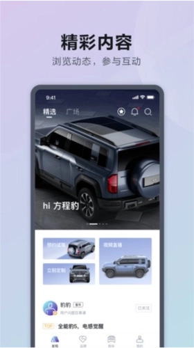 在方程豹汽车平台上,用户只需一键操作就能订购自己喜爱的车型,还能实时了解品牌最新举办的活动以及其他用户的用车故事。平台内的交流社区为用户提供了分享个人生活体验、讨论各类热门话题的空间,大家可以一起畅想个性化汽车生活的未来发展方向。同时,专业的编辑团队会不断产出优质内容,保证用户能够获取到全面且有深度的相关资讯。