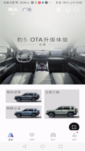 进入软件首页后,既能够预约试驾或新车,也可以进行网联认证。