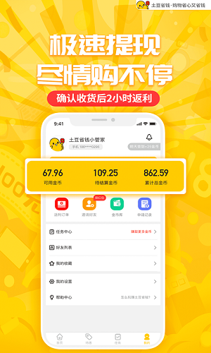 土豆省钱这个软件推荐每为用户都来试一试,用户购物不仅能够得到优惠,而且在每一次购物之后,商家都会返回一部分的佣金给用户,佣金都是真实的,可以提到微信或者其它移动支付软件使用,所以用户可以试着使用一下。